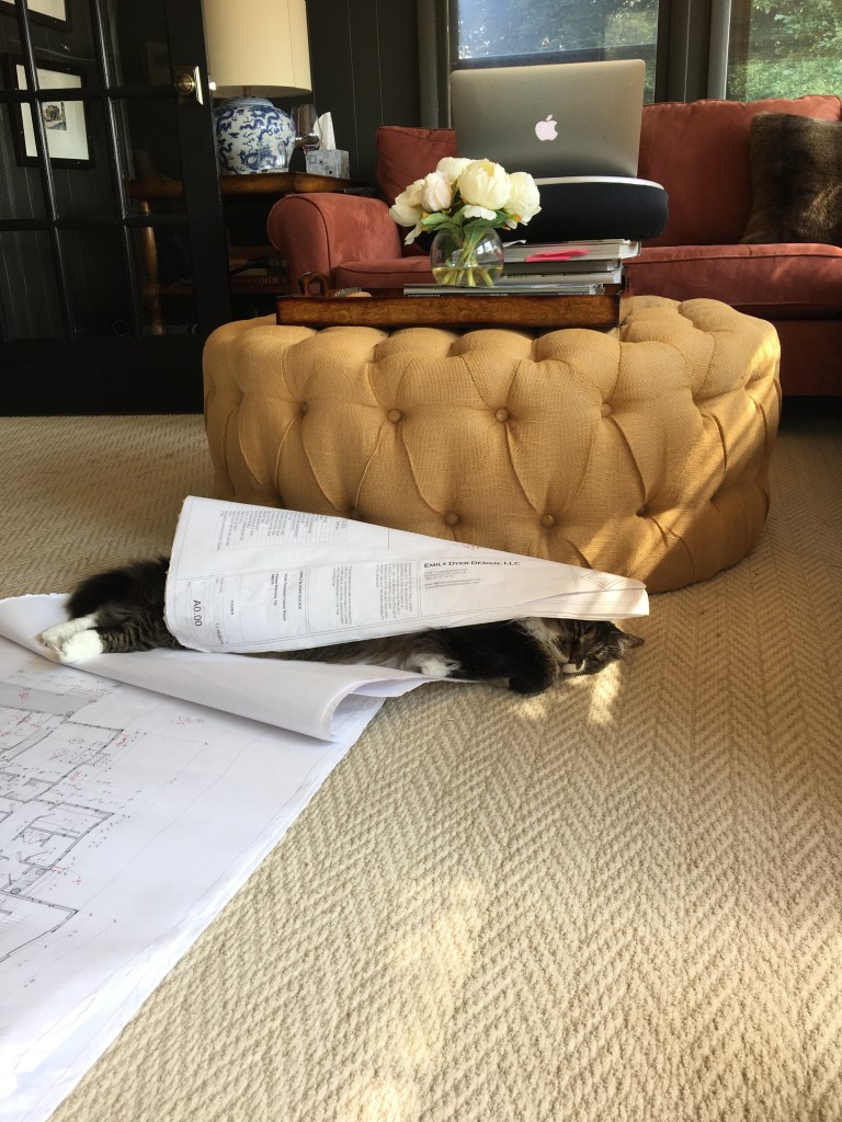As I was double-checking the door quote today, Bu decided to make himself a little napping Bu-rrito in the house plans. He stayed like this for over an hour. I’ll take it as a sign that he’s excited about the new house.