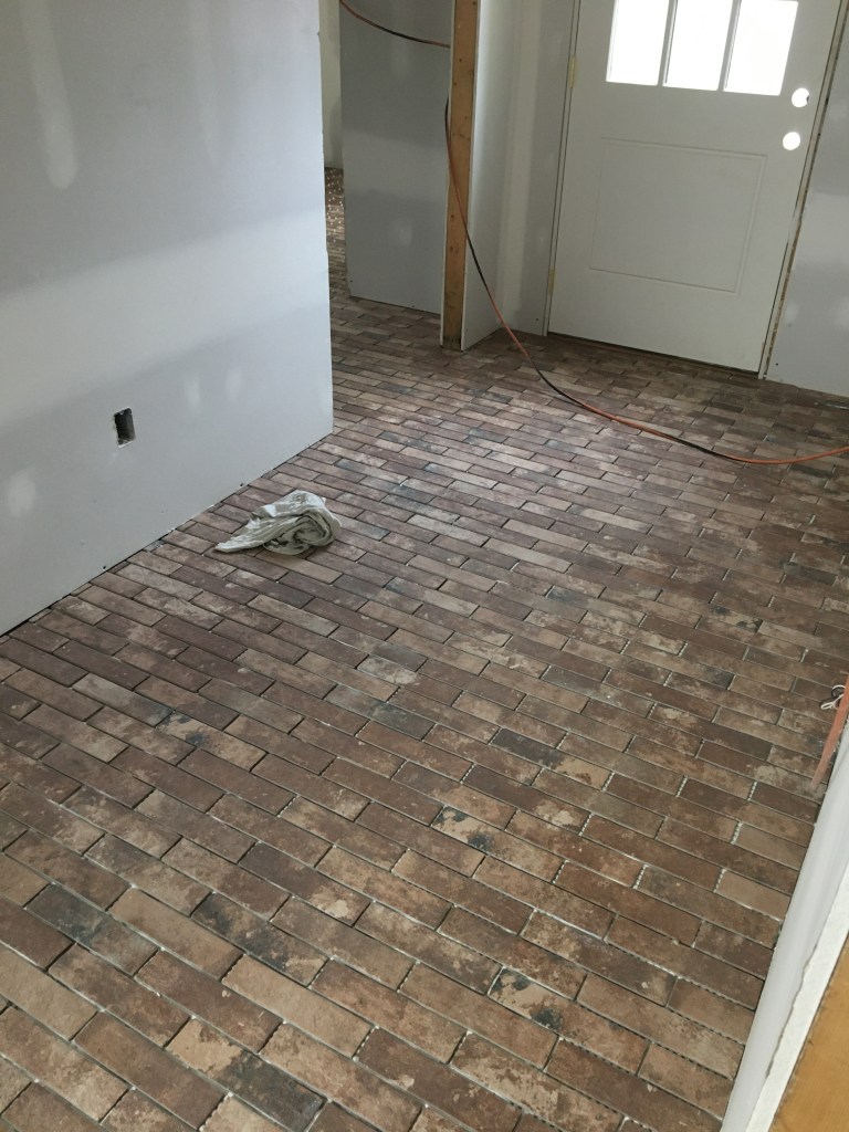 The mudroom brick floors are in. The grout will really take it over the top, but that won’t be happening until there is heat in the house (which is still a few weeks a way thanks to county electric nonsense).